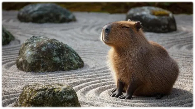 The capybara’s presence is symbolic—representing peace, resilience, and harmony with others. The capybara remains consistently calm and accepting, embodying a quiet wisdom.